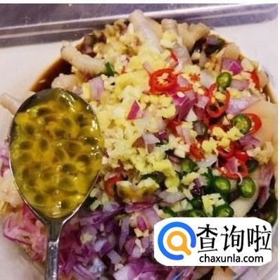 然后我们就把香菜、姜蒜、洋葱、美人椒、小米椒、切成块,柠檬切片、取出百香果,把所有东西装进一个容器里面备用。