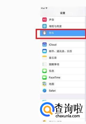 进入ipad的设置中心,一直往下滑,我们可以看到有一个隐私的选项,选择它。