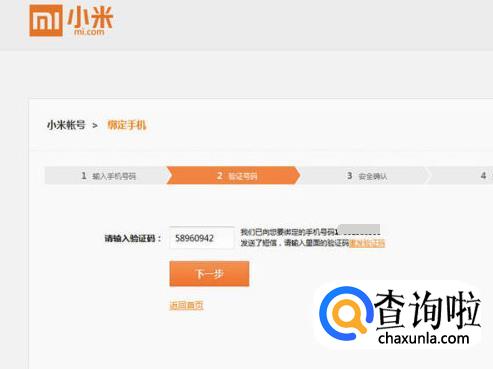 然后在”验证号码“页面中,输入手机接收到的验证码,输入好之后,点击“下一步”。