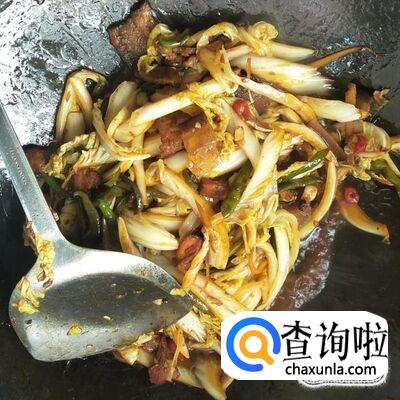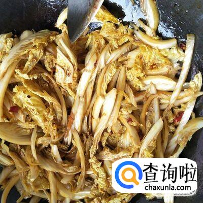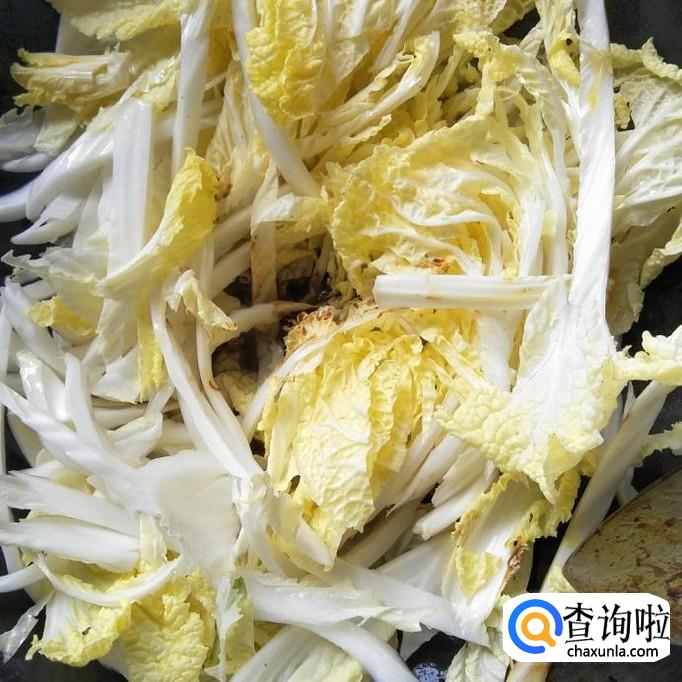 不停的翻炒,使白菜成如下图所示的样子使,关小火,将其铺开在锅中