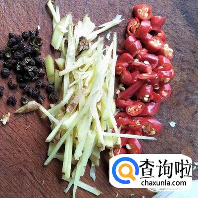 将辣椒与生姜清洗干净,辣椒切成小段儿生姜切成丝。如下图所示。
