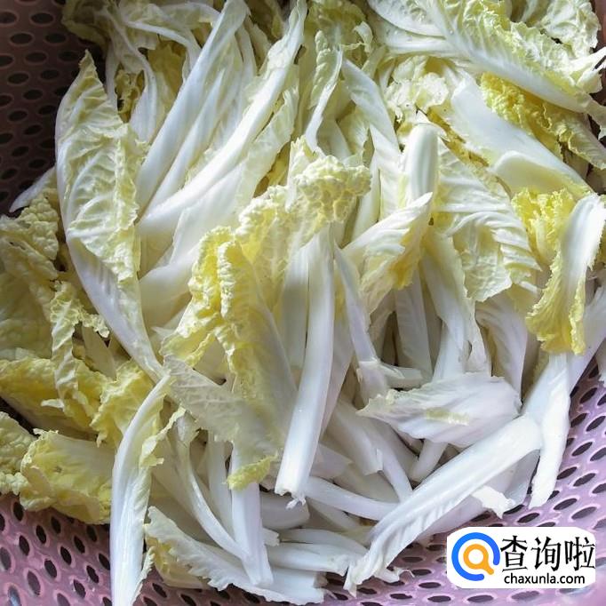 将白菜切成如下图所示的小丝儿,放入筛盆中,沥干水分