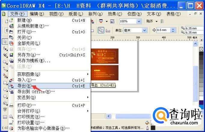 首先我们要打开CDR文件,点击“文件—导出”。