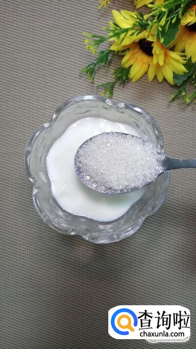 取出适量,放入杯中,加入适量白砂糖,搅拌均匀。白糖的量可以根据自己的口味进行添加。