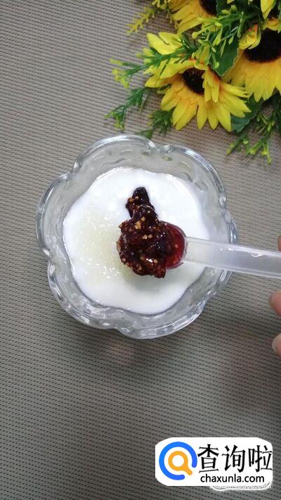 将自制的桑葚酱,盛出一勺,放入酸奶中,搅拌均匀,再将新鲜的桑葚果放到酸奶中,搅拌均匀就可以吃了,非常美味。注意,桑葚酱是用冰糖和桑葚放在锅中熬制成的,做法也非常简单,如果没有桑葚酱的话也可以省略,新鲜的桑葚果也是不错的。