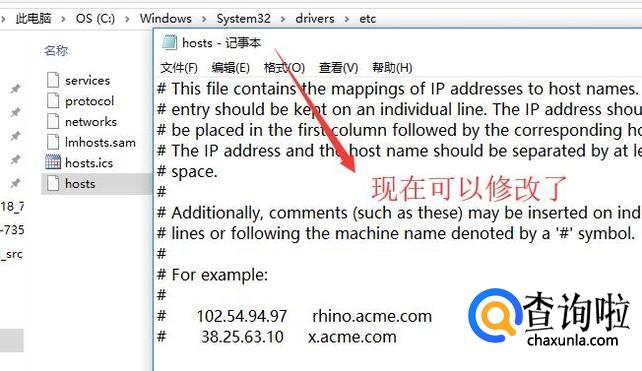 最后我们在用记事本打开hosts文件,就可以正常的修改了,如下图所示