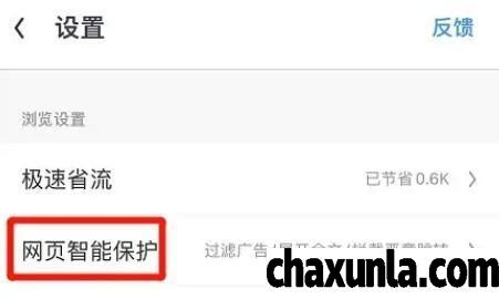 首先打开UC浏览器设置,点击网页智能保护。