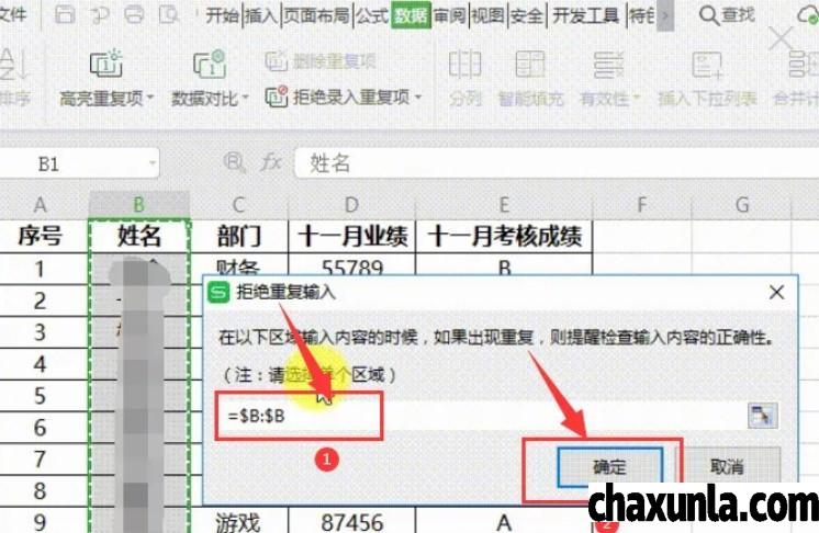 点击拒绝重复输入,选择好行列添入到其中即可,在限制的表格当中无法重复输入。