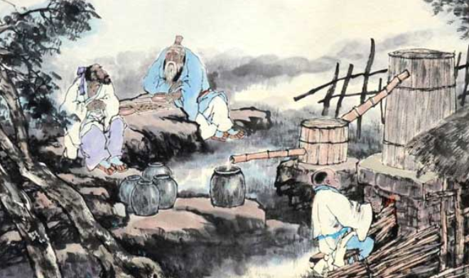 酿酒采取蒸馏法,其过程大致是:先把粮食作物磨碎,然后发酵,使之成为酒糟,再把含醇的酒糟溶入水中,加热煮沸,造成含醇的蒸馏水,即酒。初出的酒有糙味,放入地窖醇化三年,取出后清洌甘醇。酒有“和血行气,壮神御寒”的功效,因此治疾养生倍受青睐。人烦闷时饮酒,身体发热,可以暂忘思虑。魏武帝曹操在《短歌行》中就有“何以解忧,惟有杜康”的诗句。