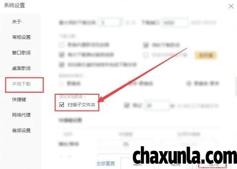 打开设置页面之后,点击左侧本地下载,在右侧添加本地歌曲地方勾选,扫描此文件即可。