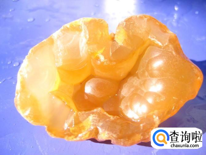 水胆玛瑙:既玛瑙内部有独立的水窝,但裸露在戈壁保存极难,绝大多数风化破裂,水分散失。目前,国内水胆玛瑙多来自巴西,注水仿造者众多,购者需明辨真伪。若天然,价值不可估量,排在所有玛瑙之首。