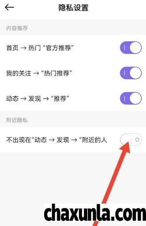 把不出现在动态发现附近的人,按钮开启即可。