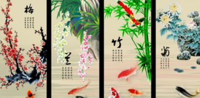 "四君子"是中国画的传统题材,以梅、兰、竹、菊谓四君子。是传统寓意纹样。明代黄凤池辑有《梅竹兰菊四谱》,从此,梅兰竹菊被称为"四君"。 画家用"四君子"来标榜君子的清高品德。《集雅蔡梅竹兰菊四谱小引》:"文房清供,独取梅、竹、兰、菊四君者无他,则以其幽芳逸致,偏能涤人之秽肠而澄莹其神骨。"四君子并非浪得虚名,确实各有它的特色:梅,剪雪裁冰,一身傲骨;兰,空谷幽香,孤芳自赏;竹,筛风弄月,潇洒一生;菊,凌霜自行,不趋炎势。关于梅兰竹菊对梅兰竹菊的诗一般的感受,是以深厚的民族文化精神为背景的。梅兰竹菊,占尽春夏秋冬,中国文人以其为"四君子",正表现了文人对时间秩序和生命意义的感悟。梅高洁傲岸,兰幽雅空灵,竹虚心直节,菊冷艳清贞。中国人在一花一草、一石一木中负载了自己的一片真情,从而使花木草石脱离或拓展了原有的意义,而成为人格的象征和隐喻。