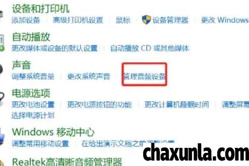在控制面板当中点击硬件与声音进入下一个页面,点击管理音频设备。