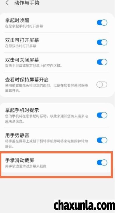 或者打开【设置】并找到【高级功能】里点击【动作与手势】之后找到【手掌滑动截屏】开启即可。