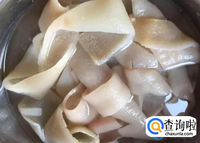 当猪皮完全清洗干净之后,切成线条再次清洗,在制作的过程当中,可能在处理猪皮方面是比较麻烦的,因为猪皮处理不干净可能会出现腥臭味。