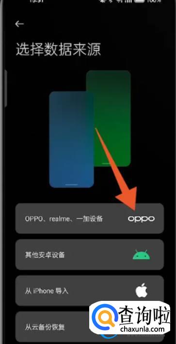 在新的页面中选择数据来源,在页面中选择旧手机的机型,这里以【OPPO】为例