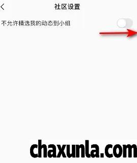 然后点击社区设置之后,将不允许精选我的动态到小组的滑动按钮,向右滑动便可以完成。