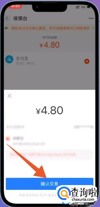在收银台的页面中,找到页面中的去付款并点击,出现窗口。