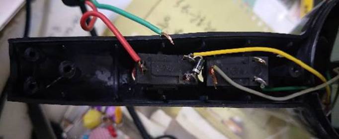 2、双档风量开关3和双档风量开关1接通时,大风量,电压全加在粗电阻丝1上;双档风量开关3和双档风量开关2接通时,小风量,电压经过二极管减半加在粗电阻丝1上。