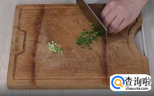 事先准备好的鸡蛋放入碗中,打散小葱,清洗干净,控干水分,直接切成葱花。