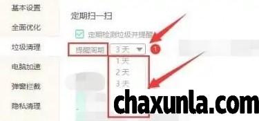最后进入垃圾清理界面中,再定期扫一扫选项当中点击提醒周期的下拉按钮。在列表选项中选择天数即可完成设置。