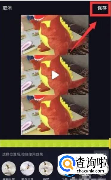这里有三屏、模糊分屏、黑白三屏可以选择,都可以分为三屏,“三屏”是正常的,“模糊分屏”是中间清晰,上下模糊,“黑白分屏”上下是黑白的,按住 添加特效。