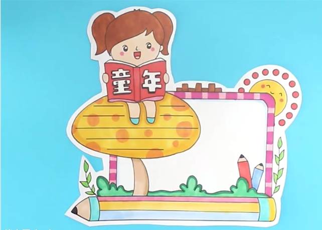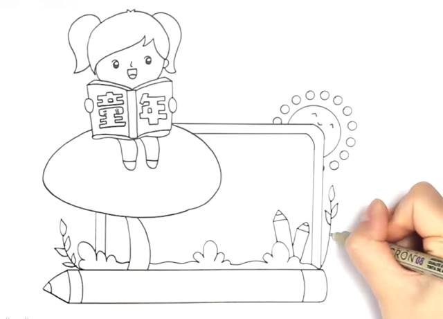 2、在小朋友的后面画出方形的读书卡边框,在下方加上植物和铅笔装饰,右上角画上一个小太阳。