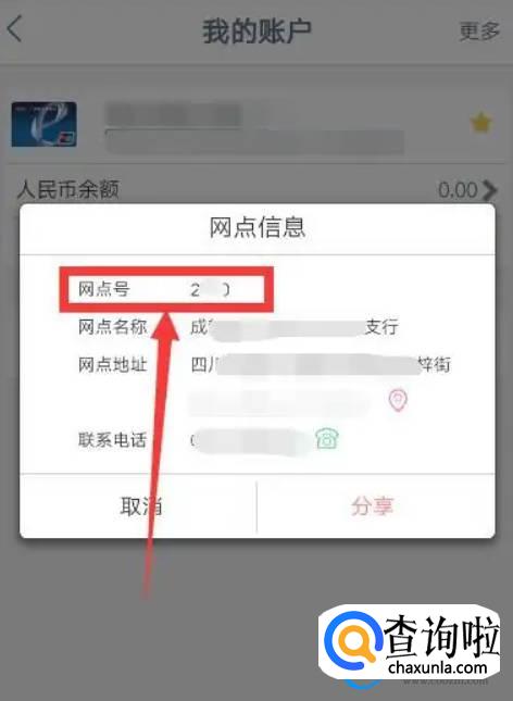 然后我们就能看到自己银行卡的开户网点号、网点名称以及地址和联系方式等内容了。