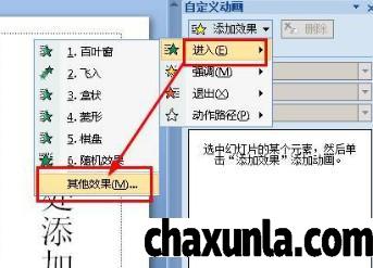 点击菜单栏上的动画,点击自定义动画,然后选择进入其他--效果。