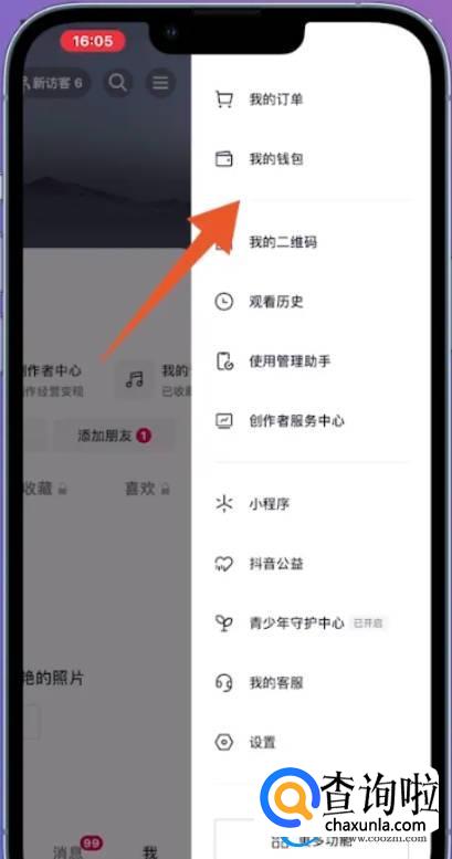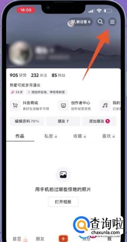 打开抖音进入我的主页面之后,点击页面右上方的三横图标。