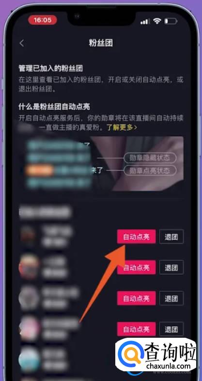 进入到管理粉丝团页面之后,点击页面中的【自动点亮】可在对应主播直播间点亮真爱粉勋章。