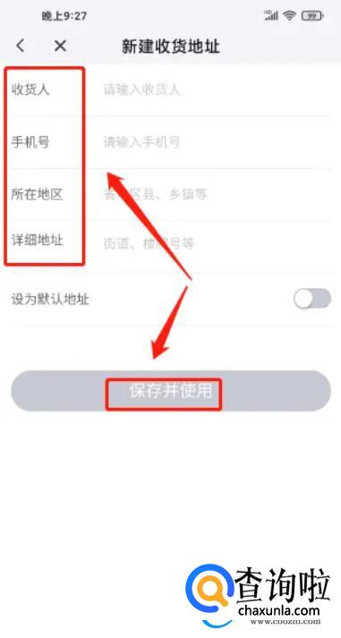 进入新建收货地址,输入收货人、手机号、所在地区、详细地址,点击【保存并使用】。