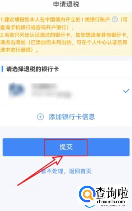 选择退税的银行卡,点击下方的【提交】即可。
