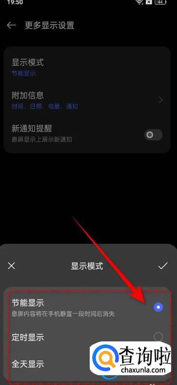 点击勾选“节能显示”此攀芬时息屏内容将在手机静置一段时间后自动显示,“定时显示”或“全体显示”即可。