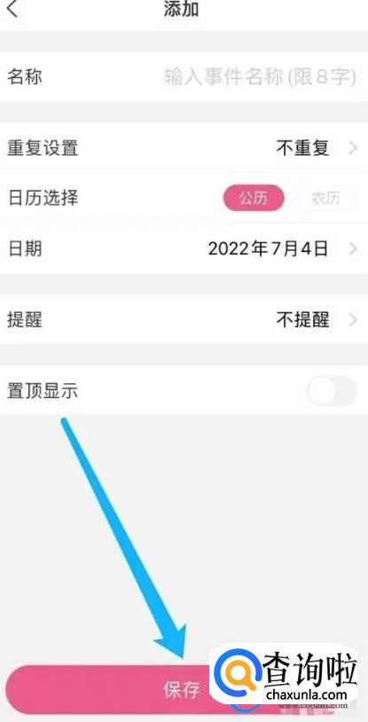 最后输入我们所要记录的事件名称以及日期,然后点击保存即可。