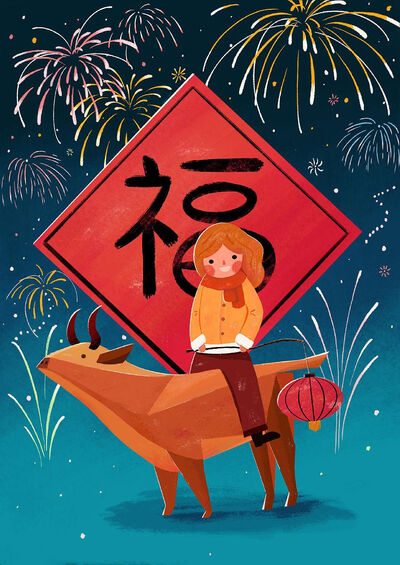 6、牛年到来喜洋洋,喜笑颜开神飞扬。只为吉祥身边傍,阳关大道任你闯。