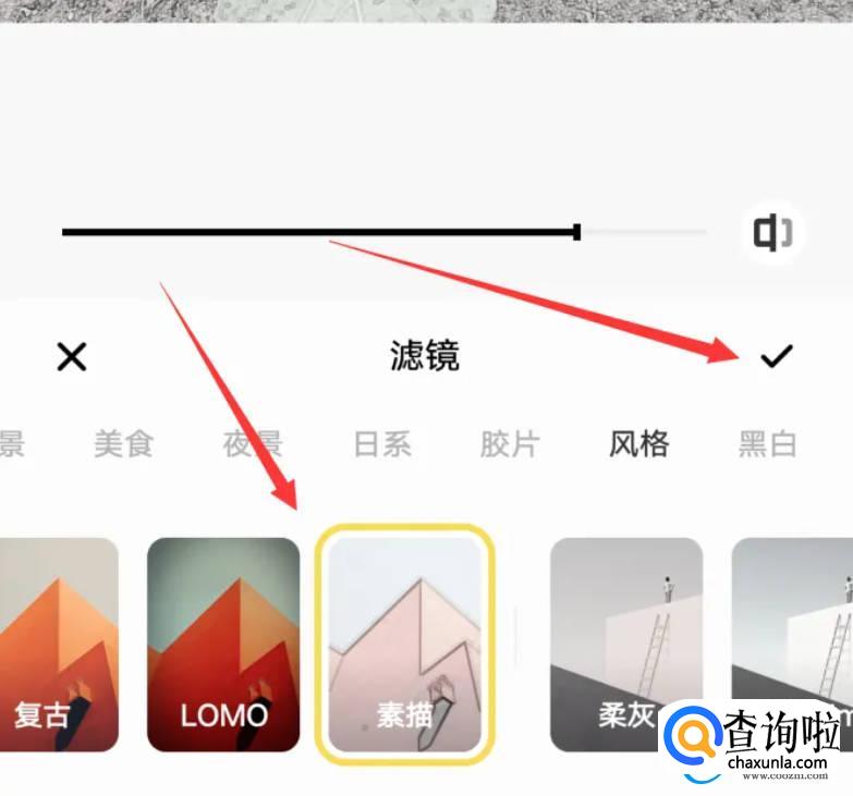 在“滤镜”设置窗口中,点击选中【素描】功能项,点击【确定】图标返回上一层功能。