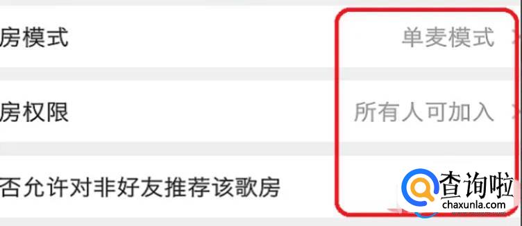 进入到创建歌房的界面中,我们需要先设置【歌房模式】、【歌房权限】以及【是否允许对非好友推荐该歌房】这三个内容。