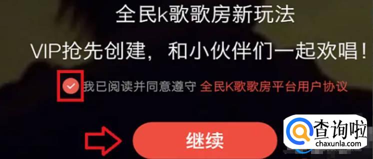 我们需要在【阅读并同意《全民k歌歌房平台用户协议》】前打上勾。