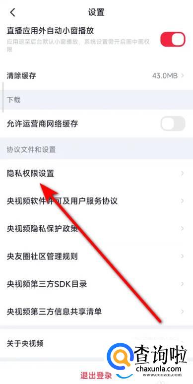 在软件设置面板中选择【隐私权限设置】,点击打开。