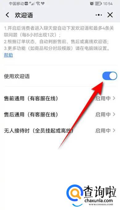 当“使用欢迎语”旁的小滑块处于点亮状态时即表示此时已经启用自动回复功能,点击该小滑块。