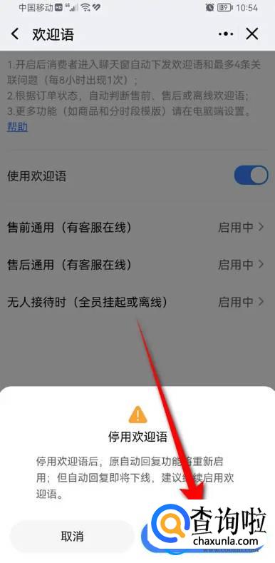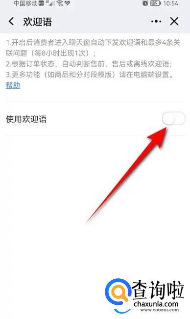 将“使用欢迎语”旁的小滑块点暗即可停用自动回复。