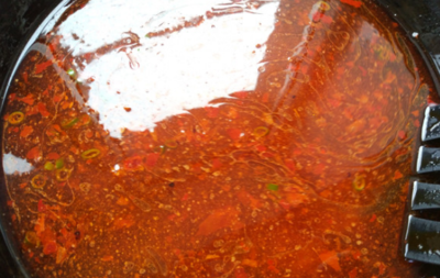 下一步,加入辣椒碎、盐、白砂糖、鸡粉、葱、蒜等调味料,以及1000克水或高汤倒入锅中,煮至沸腾。