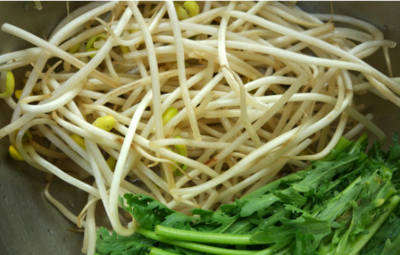 之后放入豆芽和茼蒿,稍煮片刻后捞出铺在碗底,然后放入腌好的鱼片到锅中,煮5分钟左右。