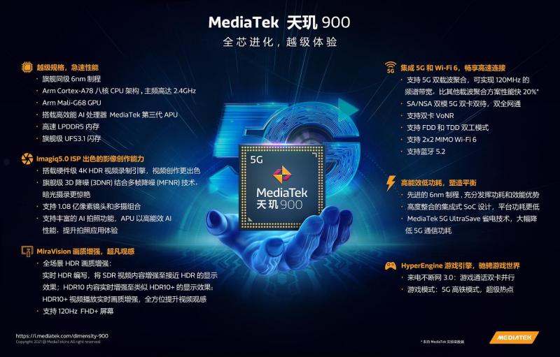 规格方面,天玑900的CPU部分采用了八核心架构,包括两颗主频2.4GHz的A78核心以及六颗2.0GHz的A55核心,GPU型号则是Mali-G68MC4,最高支持120Hz刷新率。此外,天玑900还集成了联发科的第三代APU。