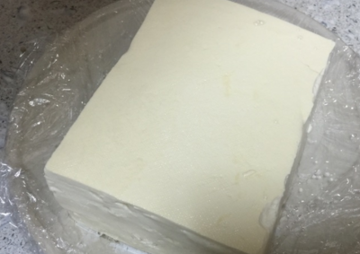 接着把菜板也包上保鲜膜压在豆腐上,菜板上压一碗水。把豆腐里的水压出来。半小时倒一次水,倒四次。