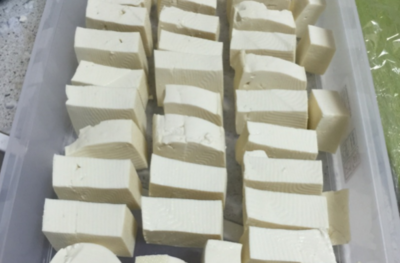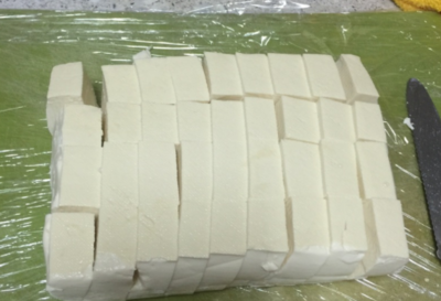下一步,将把切好的豆腐整齐的放在盒子里,每块豆腐之间留一点间隙。