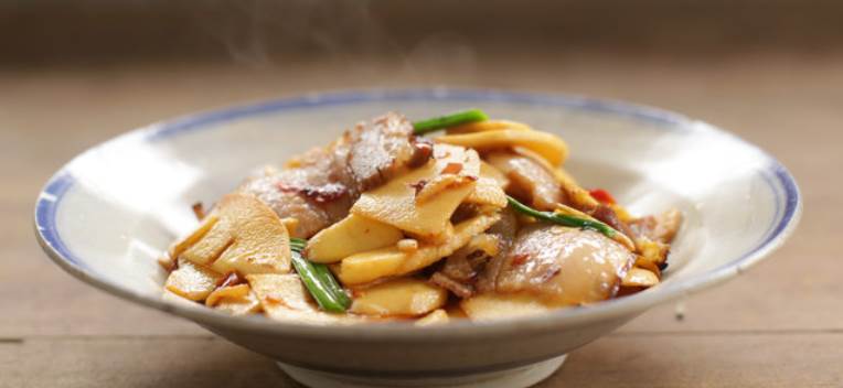 冬笋炒腊肉,这道菜应该算得上是湘菜中的经典了。每到冬笋上市的季节,大部分的湘菜馆都会推出这一湖南特色菜。鲜嫩的冬笋再配上腊香味十足的腊肉,那种滋味不摆了,脆嫩兼备,咸鲜干香,回味悠长。不过做菜时要注意炒冬笋的时候油温不要太热了,否则不能使笋里熟外白。