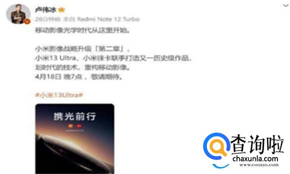 4月18日,小米徕卡联手打造的小米13 Ultra正式发布。然而,小米集团卢伟冰在为小米13 Ultra预热的时候,却使用了Redmi Note 12 Turbo来发微博。对此,他表示“不舍得Redmi Note 12 Turbo”。